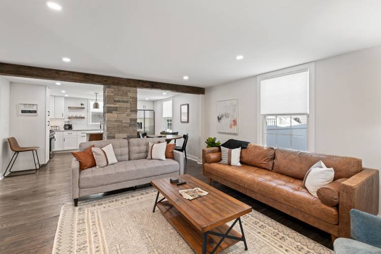 The home comfortably sleeps up to eight guests across four beautifully furnished bedrooms, each featuring a smart TV, dresser, and ample closet space. Two bedrooms offer king beds, one includes two twin beds, and another features a king suite on the first floor—ideal for those who prefer to avoid stairs. Each of the three bathrooms is modern and well-appointed, with walk-in showers and single vanities. With dual-zone HVAC, stylish furnishings, and an unbeatable walkable location close to Belmont’s restaurants and the Downtown Mall, Monticello Getaway is the perfect choice for a convenient and comfortable extended stay in Charlottesville.